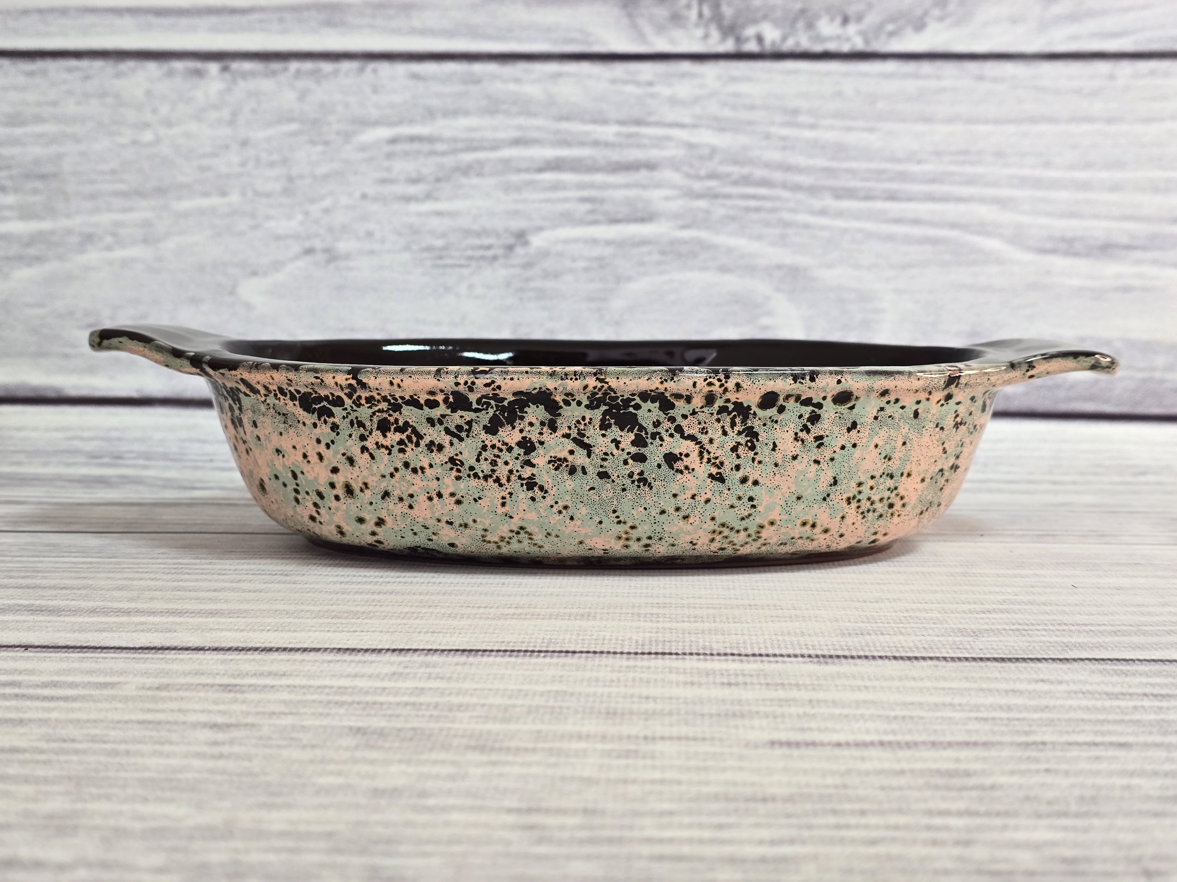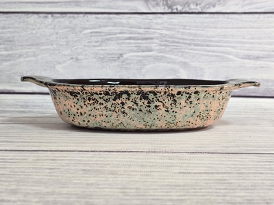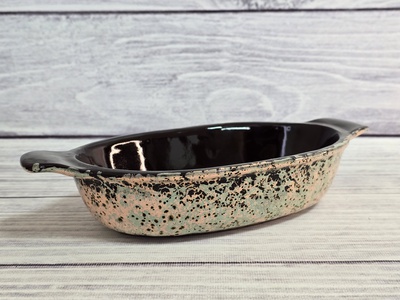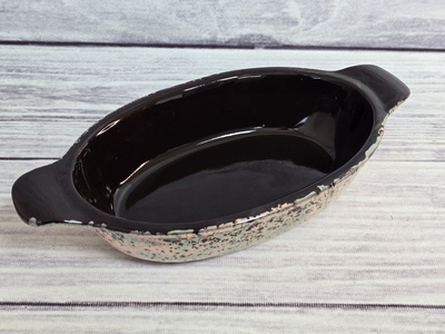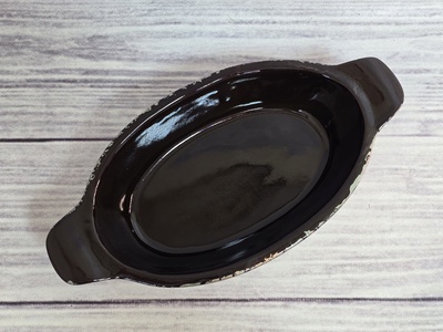 Жаровня Смак подходит для тушения или длительного томления овощей, мяса. В ней можно подать салат к столу. Это долговечная и удобная в использовании вещь. Она сделана из керамики и имеет продуманную форму, что обеспечивает теплообмен между жаровней и блюдом, а также помогает сохранить полезные свойства продуктов. Посуда имеет традиционный русский дизайн.