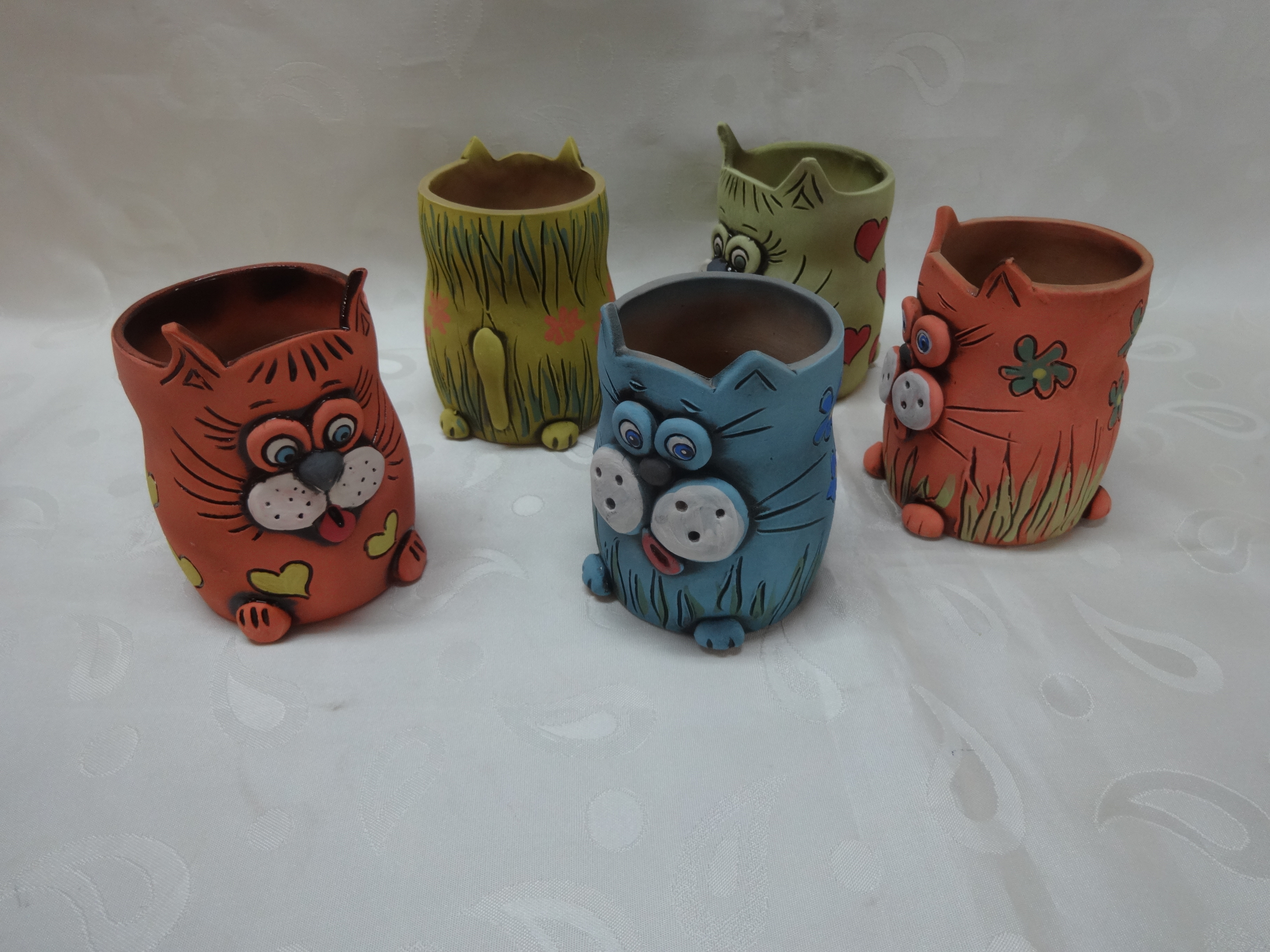 Керамическая карандашница в виде кошки, ручная роспись. Покрытие - глазурь. Изделие полностью изготавливается вручную, поэтому возможны отличия в оформлении от представленного на фото. Наш менеджер, получив заказ, предложит имеющиеся в наличии варианты.