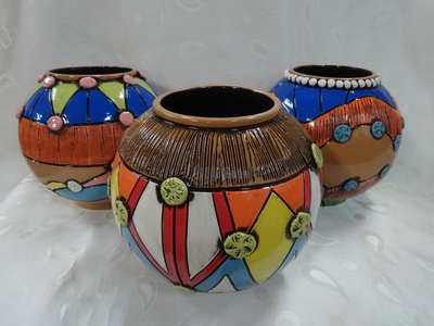Ваза-шар в эксклюзивном оформлении. Полностью ручная работа. Покрытие - глазурь. Изделие полностью изготавливается вручную, поэтому возможны отличия в оформлении от представленного на фото. Наш менеджер, получив заказ, предложит имеющиеся в наличии варианты.