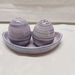 Керамические солонка и перечница. На керамической подставке удобной формы с бортиками, предотвращающей падение. Донышко солонки и перечницы закрыто пробкой. Отличный набор на стол как для повседневного использования, так и для праздничных застолий. Глянцевая поверхность